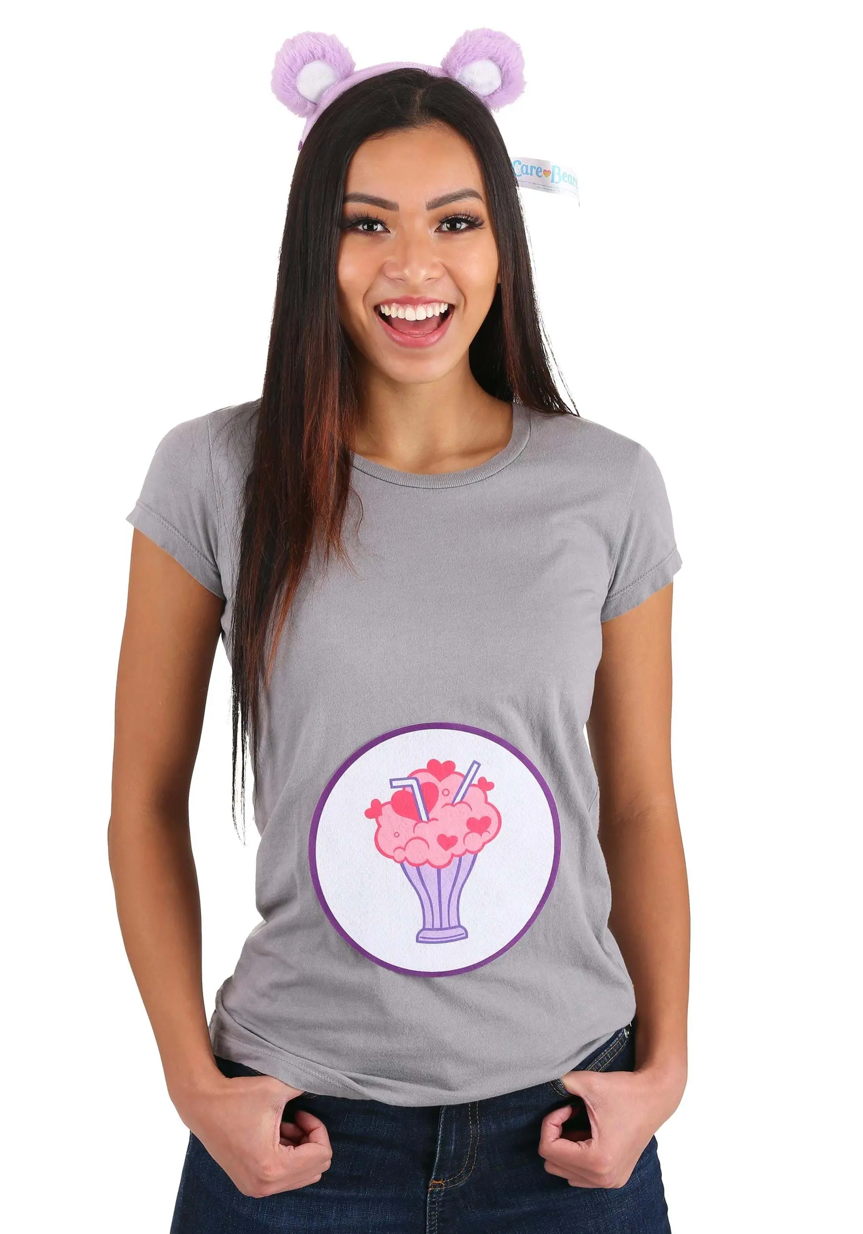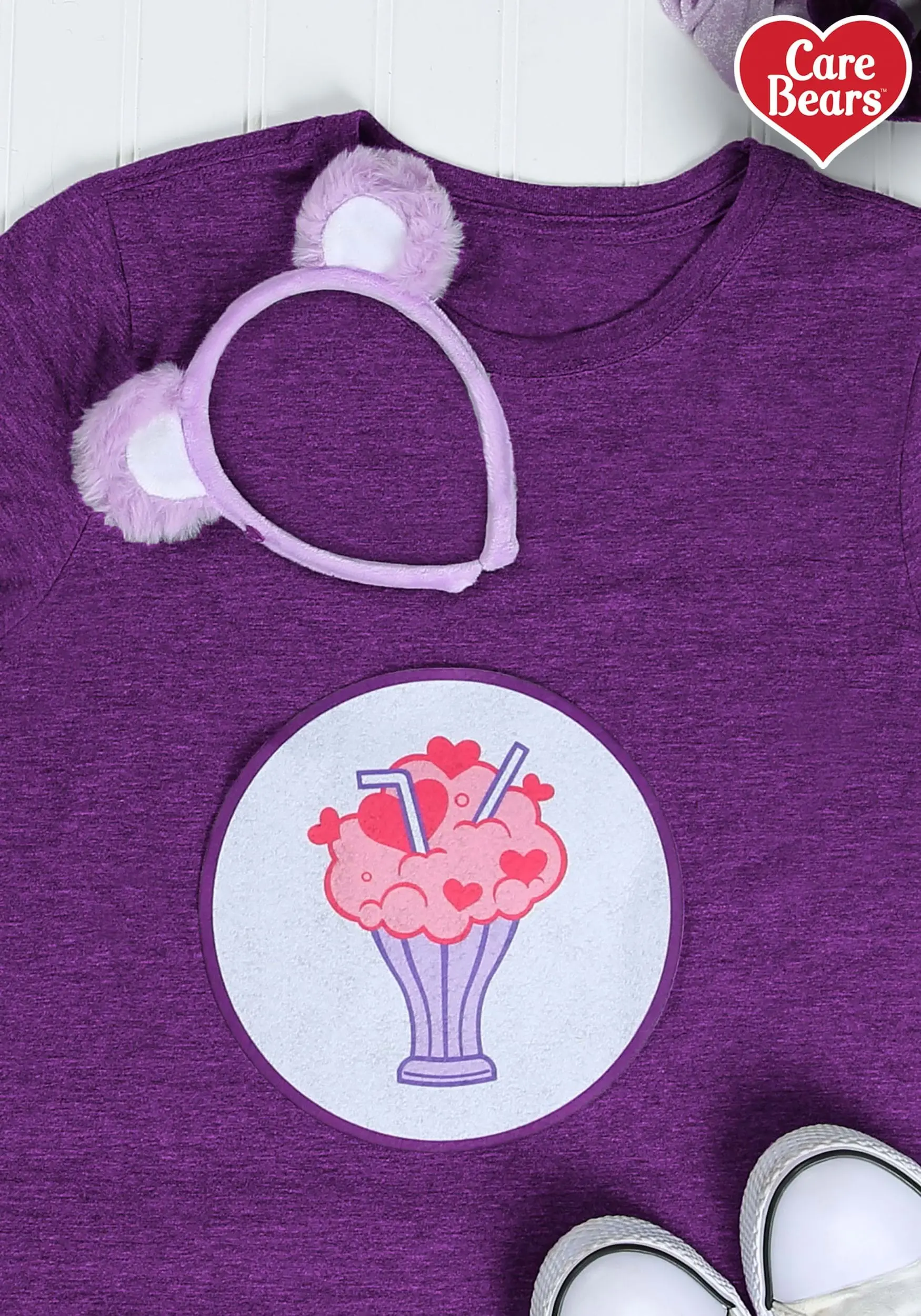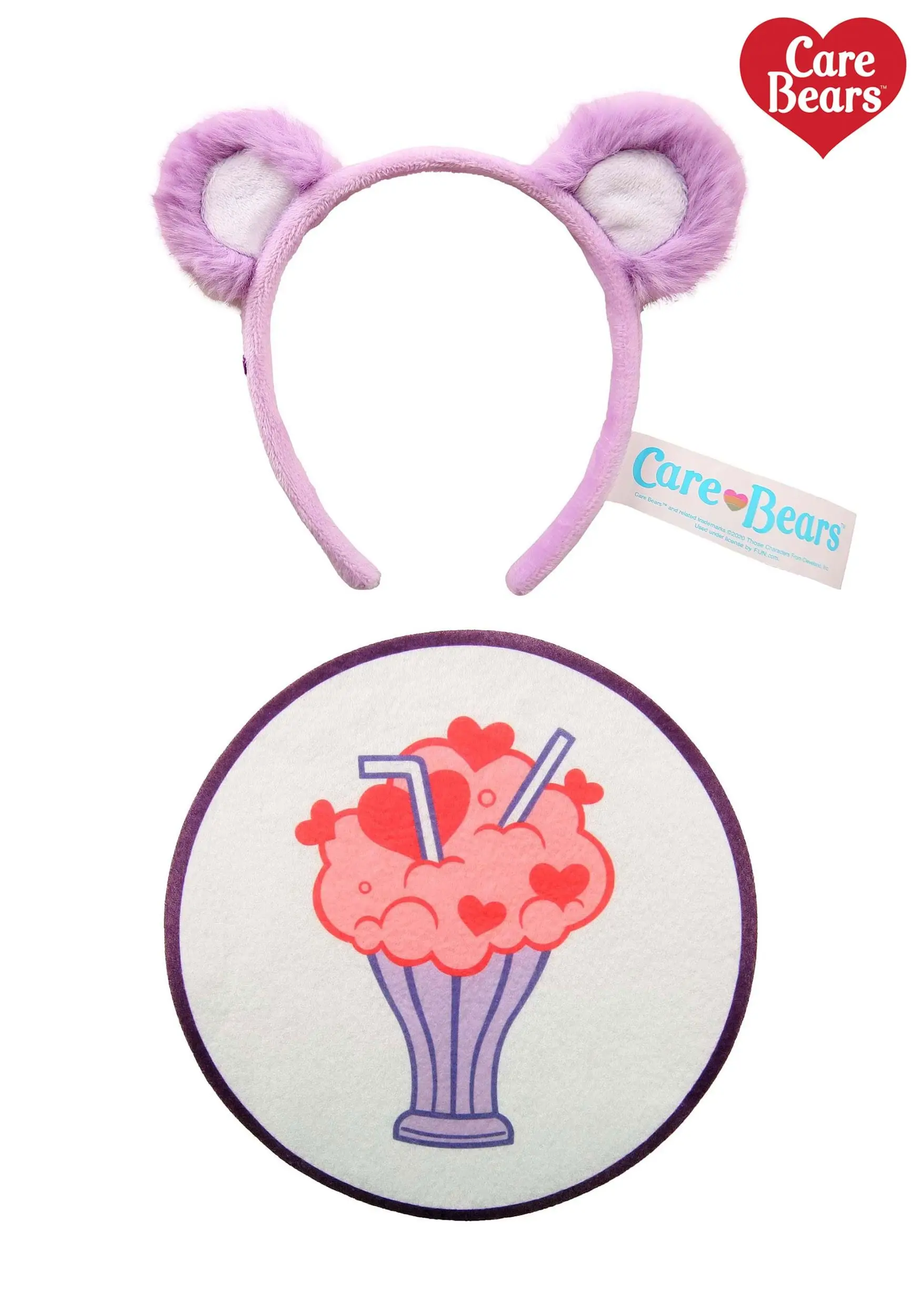 The two-part kit includes the signature Share Bear belly badge of a milkshake with two straws. It can attach to any clothing item you like and makes you look instantly authentic. The furry lavender ears are affixed to a fabric-covered headband. Don a full purple sweatsuit for more of a costume look or layer them over everyday clothes for a fun Saturday around town!