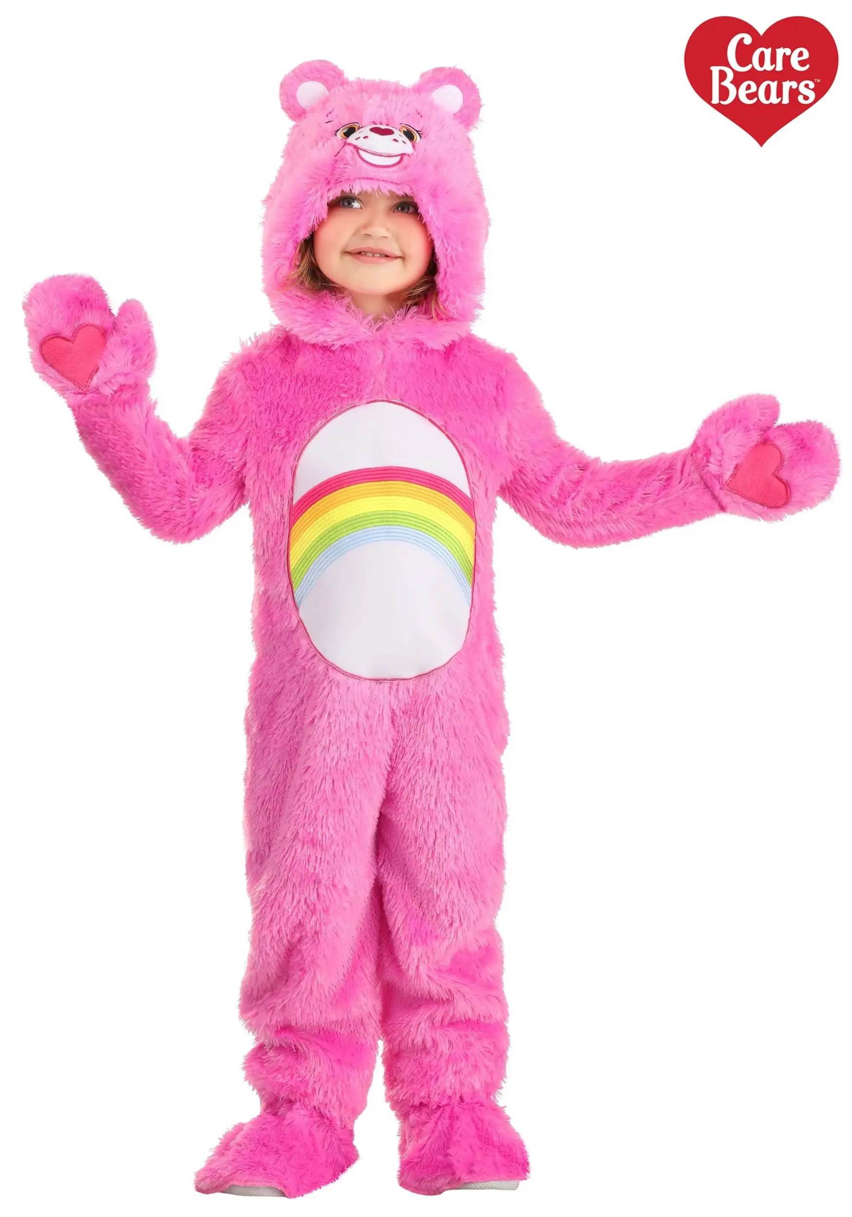 Let your kiddo express their chipper side with this Toddler Classic Cheer Bear Costume! This officially licensed ensemble includes a jumpsuit and pair of shoe covers for one easy head-to-toe look. The jumpsuit is bright pink and fuzzy, just like Cheer Bear, and even includes her rainbow belly badge on the front. The hood is embroidered with her cute face and features her ears on top as well. The attached gloves, which will give your kiddo soft pink paws, are the perfect detail to finish off the costume. Your little one won’t be able to help but be cheerful when they put on this cozy outfit!