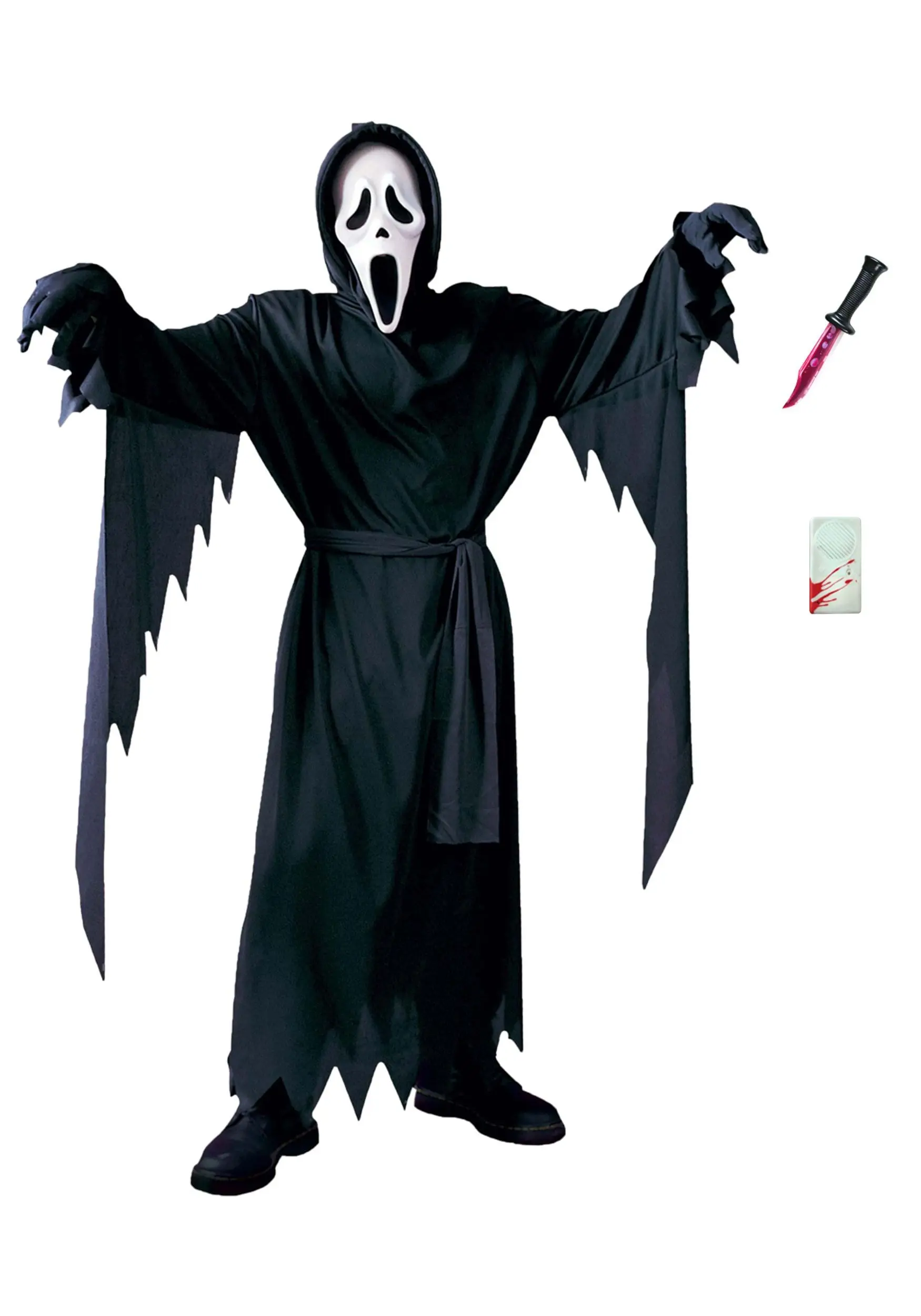 Let your kiddo let loose a wide grin when they step into the role of the new classic horror movie killer. This officially licensed Ghost Face Costume Set for Kids includes the iconic hooded robe, mask, and a pair of accessories that will bring the look to life. Long draping sleeves are fun to have trail behind as they hunt down treats and the Scream mask lets them feel like they are part of movie history! The bleeding knife is a perfectly safe faux weapon and the 25th Anniversary Scream voice box lets them sound off in style.