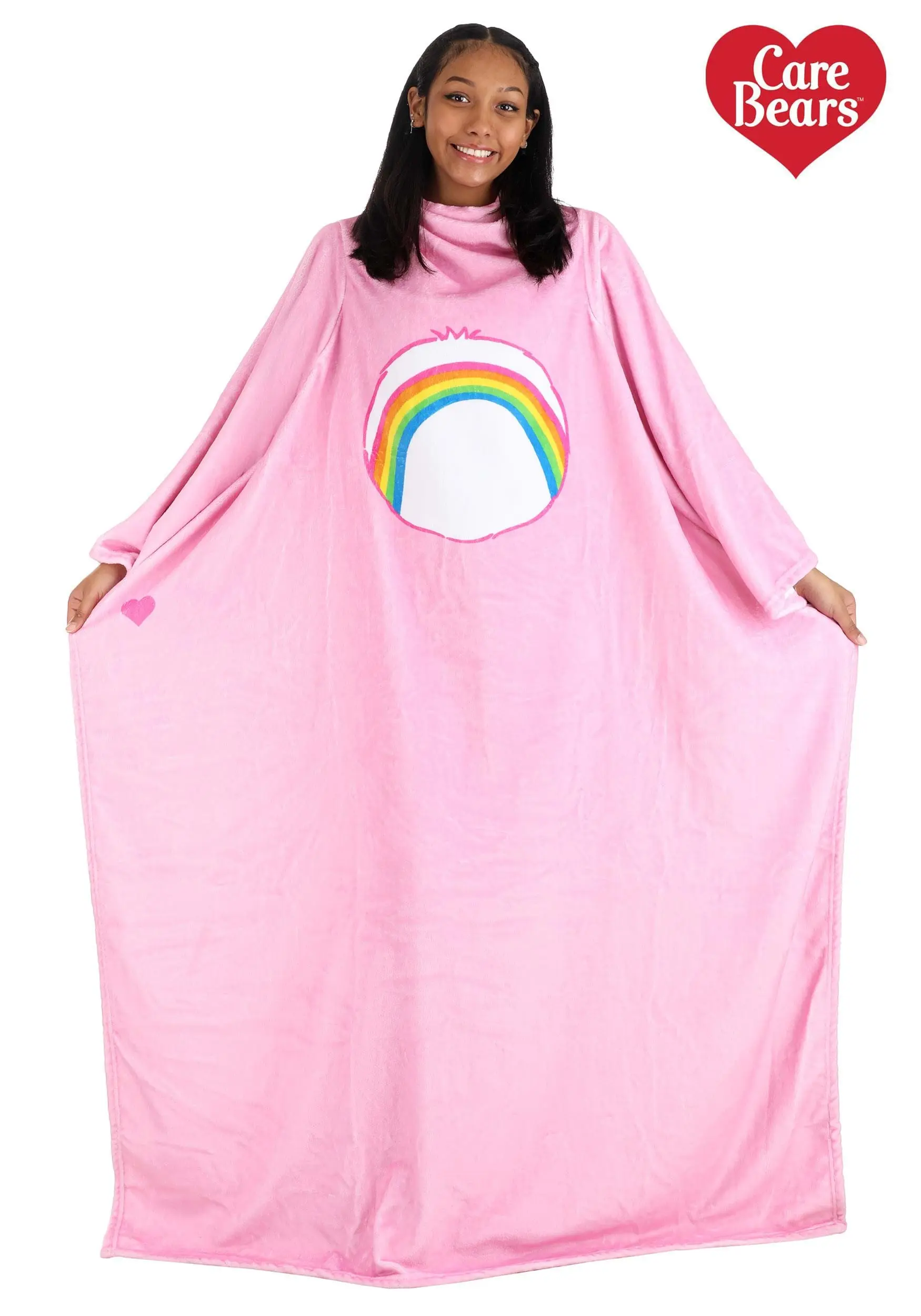 Make any day more, well, cheerful with this exclusive, officially licensed Cheer Bear Care Bears Wearable Throw! The soft pink polyester throw blanket slips on over your head and has long, oversized sleeves. The front is printed with Cheer Bear’s rainbow symbol.Â