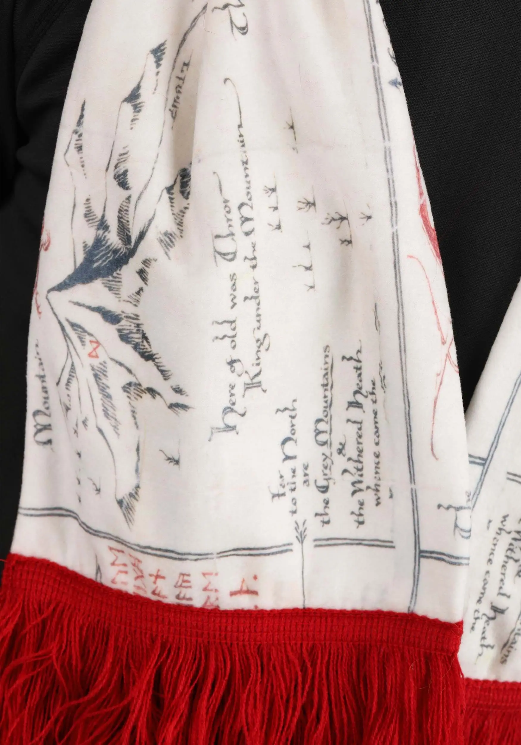 The matching scarf continues the map design, highlighting more locations from Middle-earth. The scarf has bright red fringe on the ends, reminiscent of the fiery breath of Smaug!