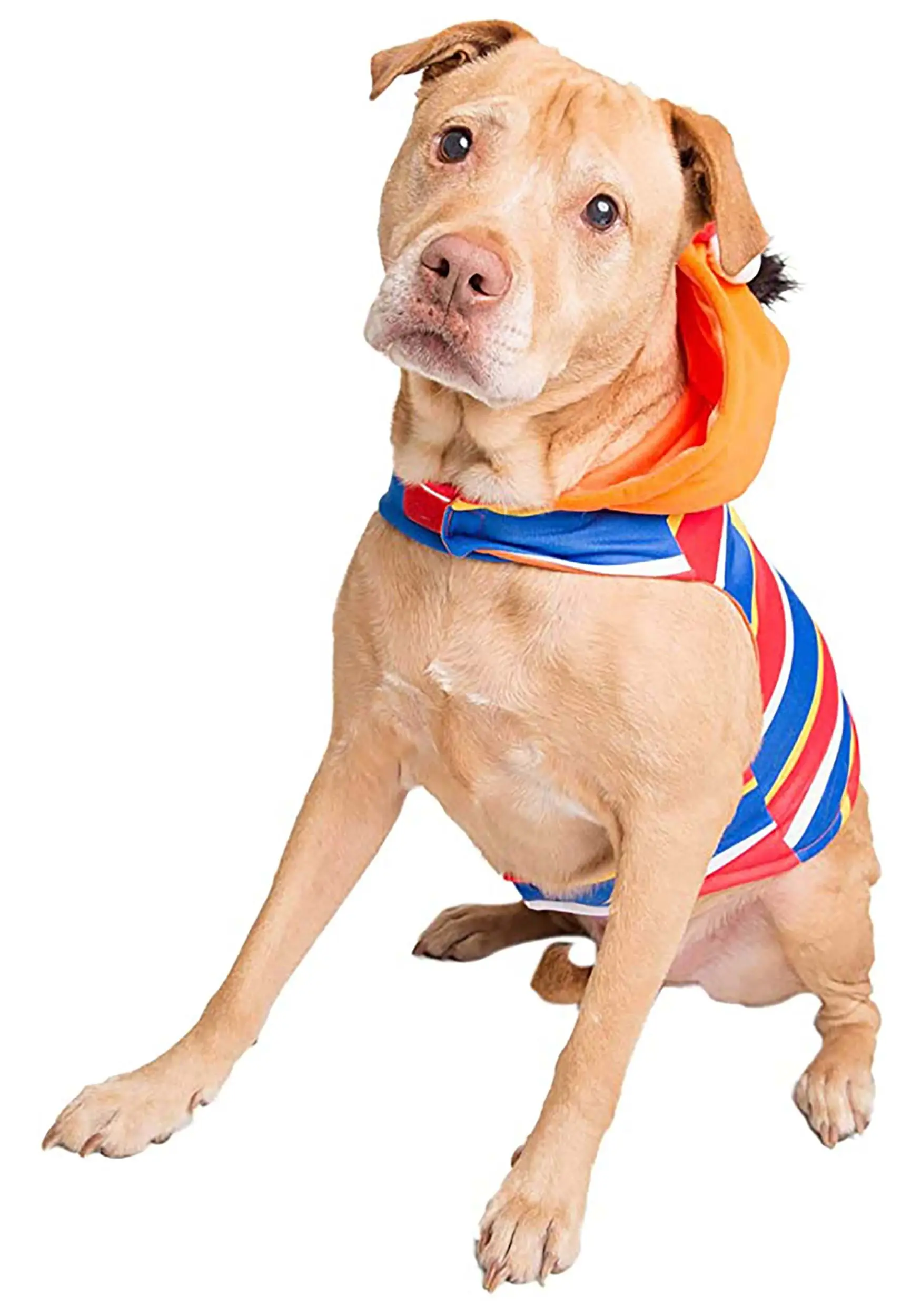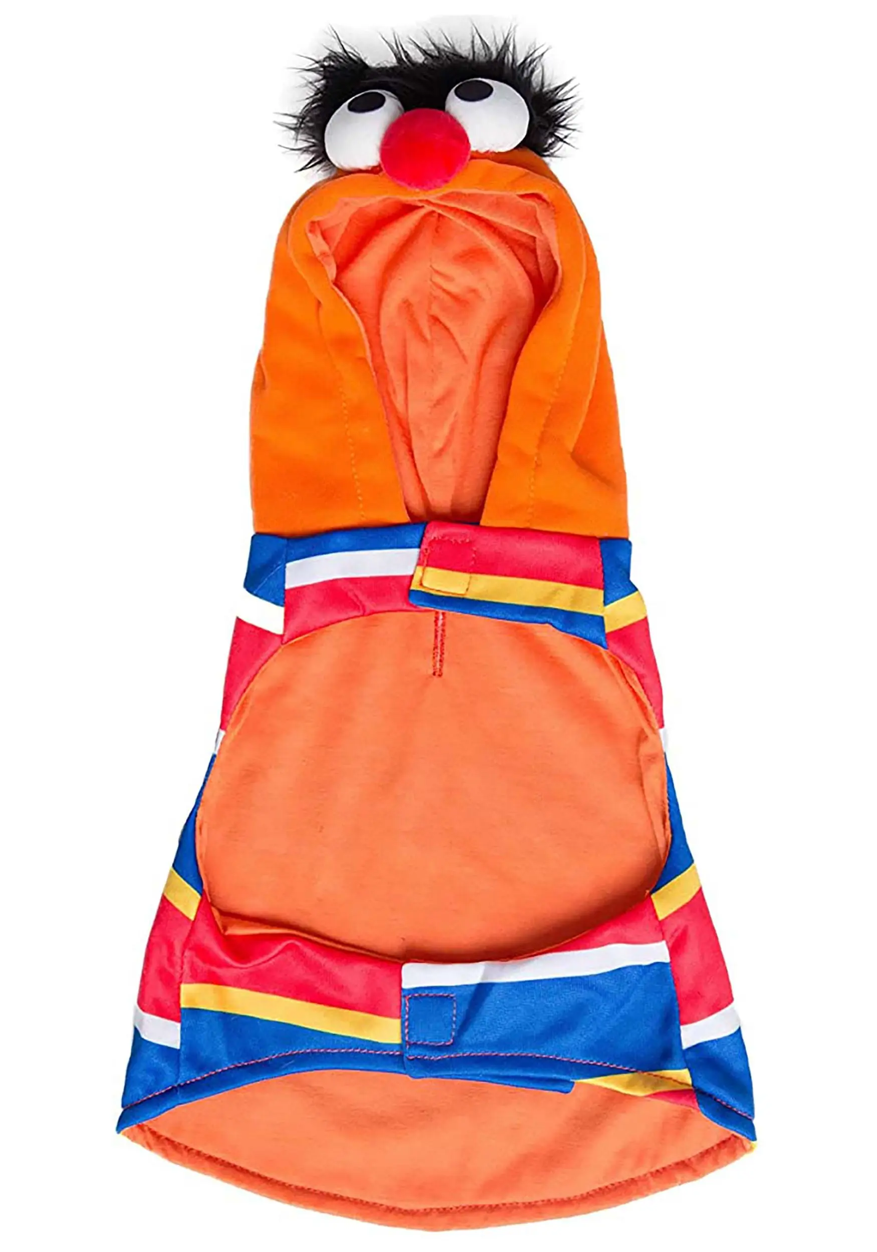 If your pet has a zany sense of optimism and a winning personality, they need this officially licensed Ernie Pet Costume from Sesame Street! The outfit consists of a tunic made of one hundred percent polyester that has just a little bit of stretch for a comfortable fit. The torso is striped horizontally with alternating blue, white, red, and yellow stripes just like Ernie’s favorite shirt. Hook and loop fasteners under the tummy and under the chin keep it securely in place. The attached orange hood features a tuft of black faux fur, as well as two fiberfill-stuffed eyeballs and a stuffed red nose.