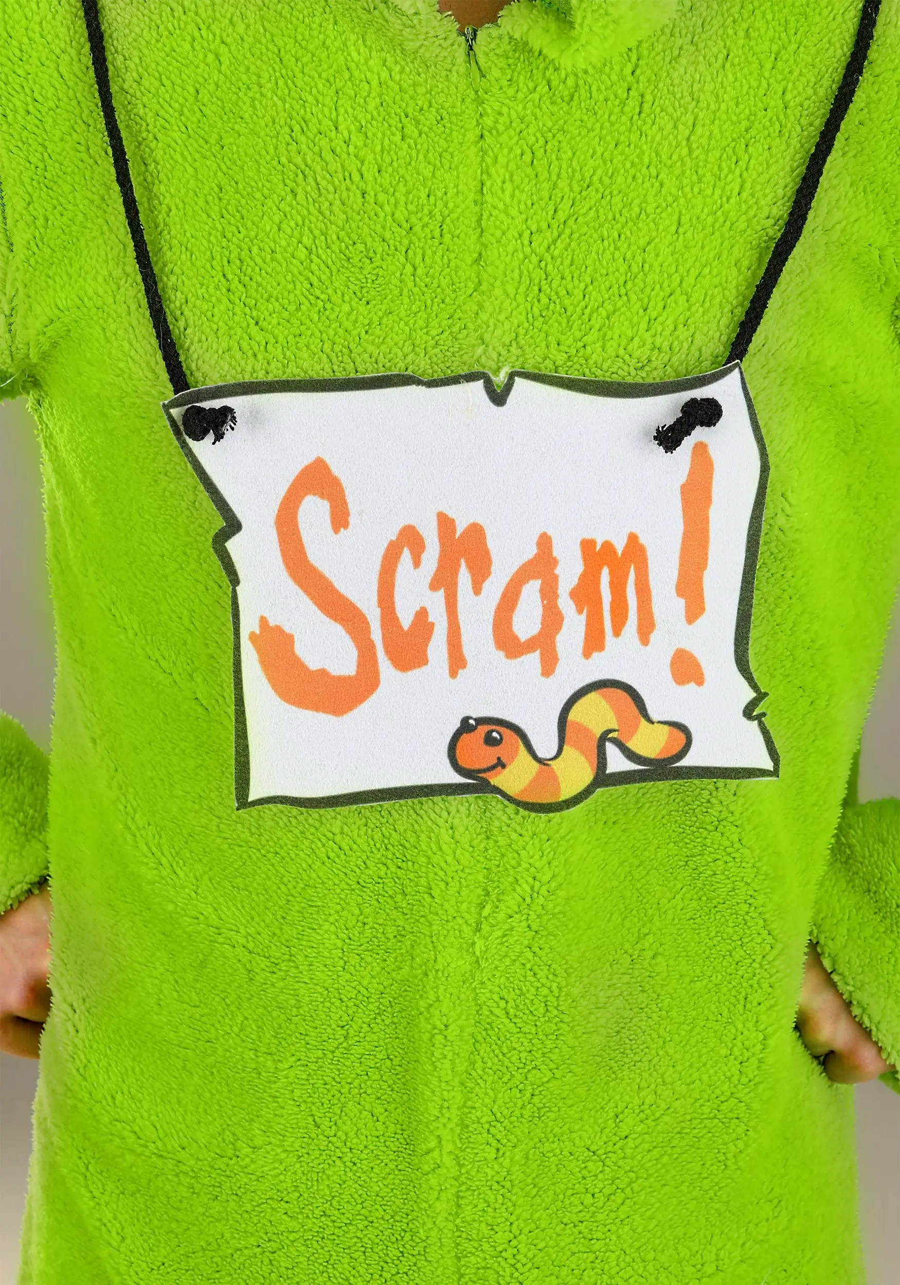 You don’t need to love living in a garbage can to love this exclusive, officially licensed Adult Oscar the Grouch Costume Jumpsuit! The green jumpsuit zips up the front and is made of super-soft short pile faux fur. Elastic in the wrist and ankle openings help to keep you snug. The attached hood is sewn with appliqued and embroidered eyes, as well as bushy eyebrows made of bround faux fur. The included felt sign can be hung from the cord attached to each shoulder. It reads “Scram!” and is printed with an image of a worm.Â